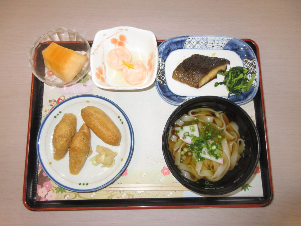 新年会御膳。いなり寿司、きしめん、銀鱈の照り焼きなど、美味しく頂きました。